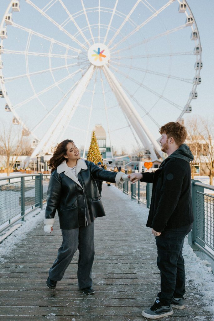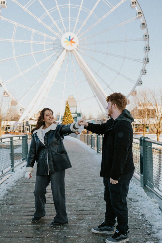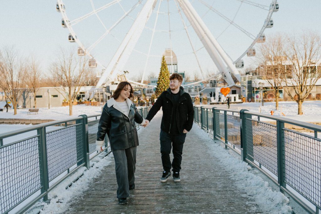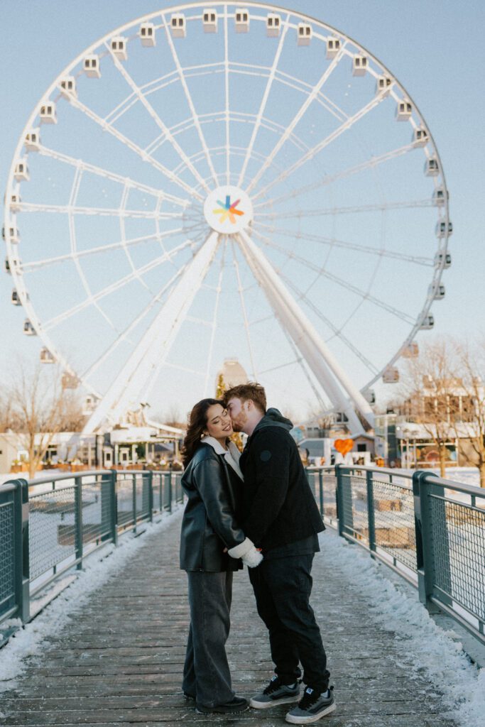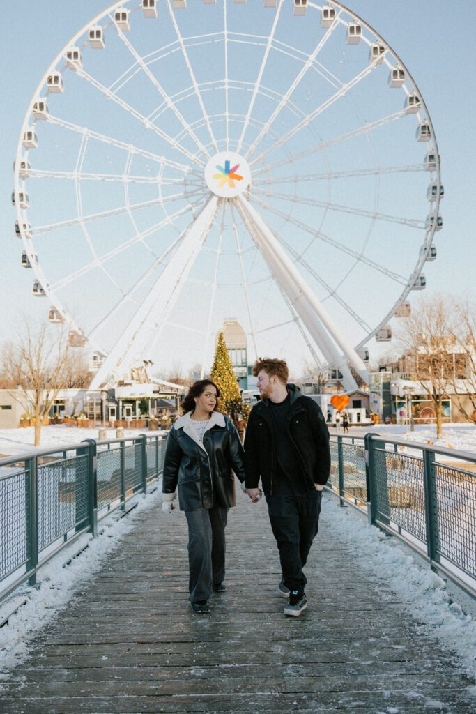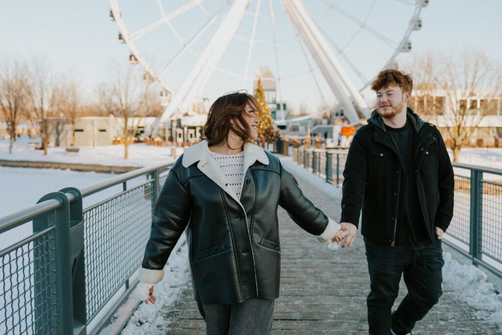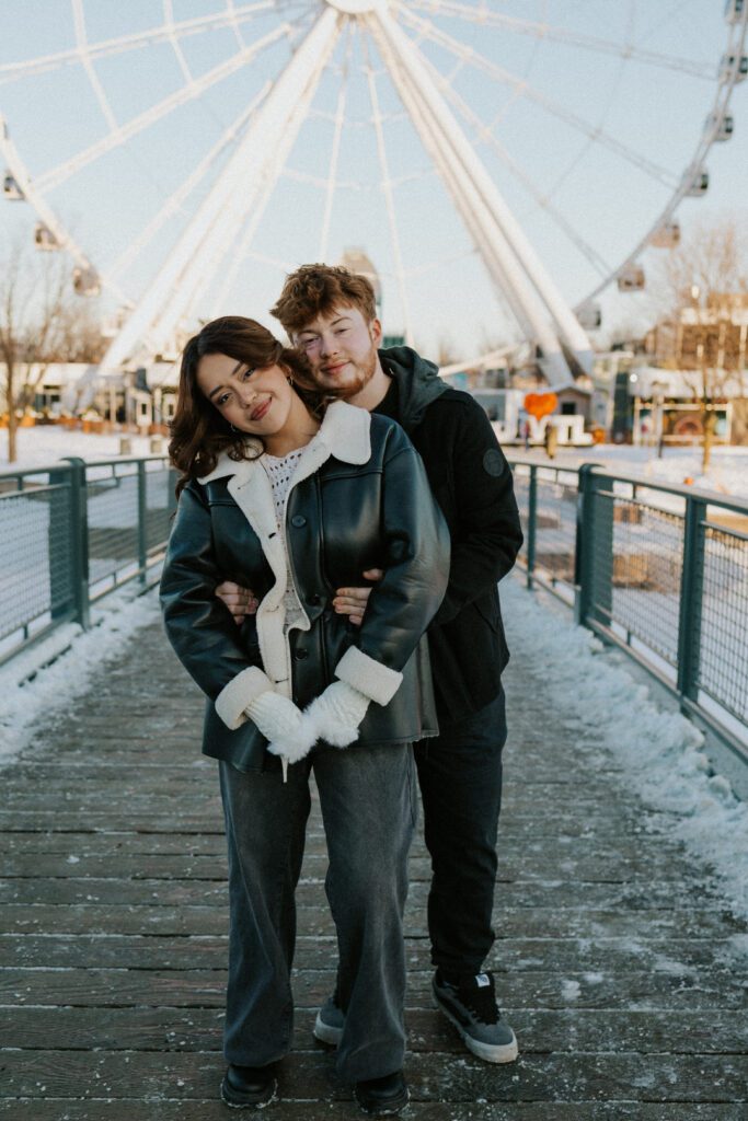One of the most striking backdrops for engagement photos in Montreal is La Grande Roue de Montréal. In winter, the crisp air and snowy ground give the area a clean, bright aesthetic that feels fresh and elevated.