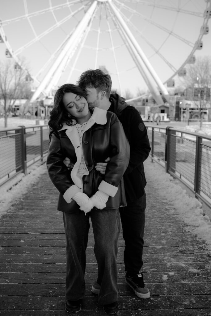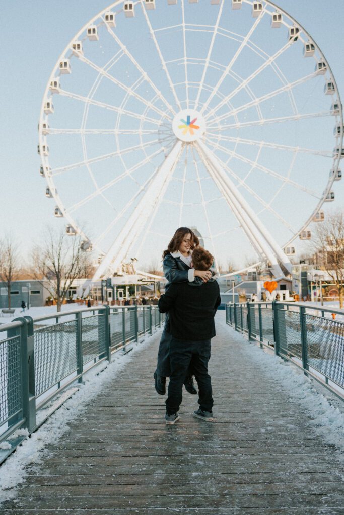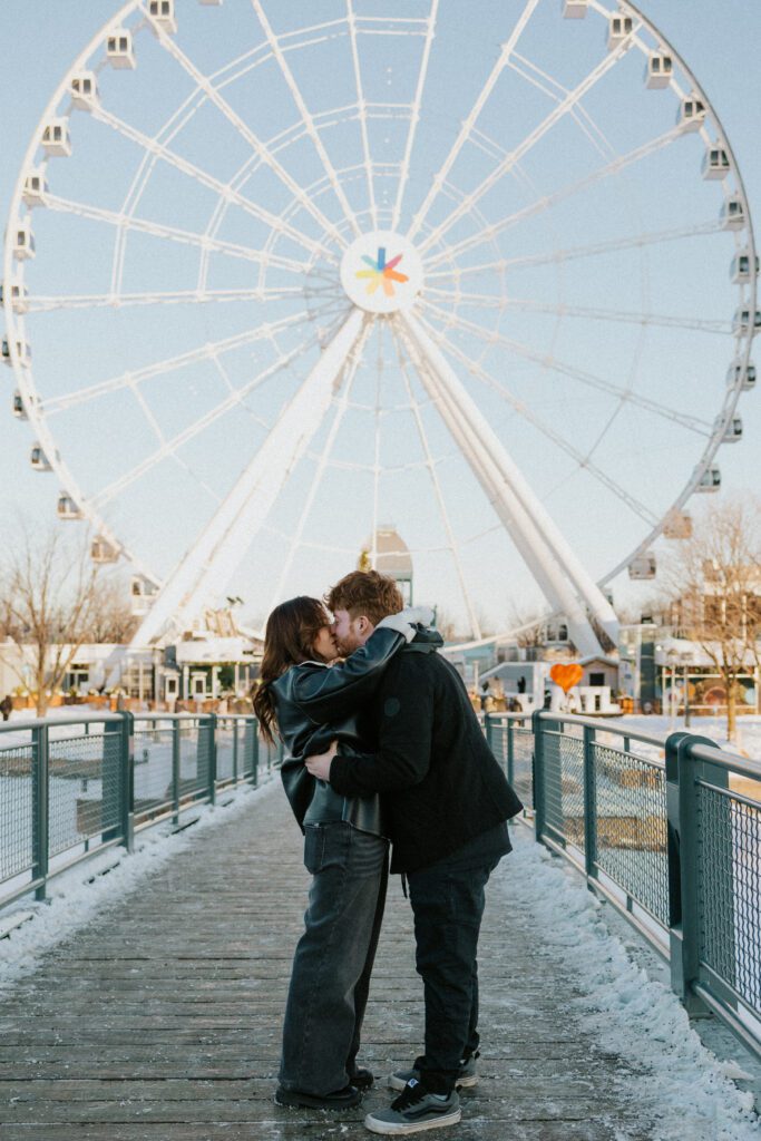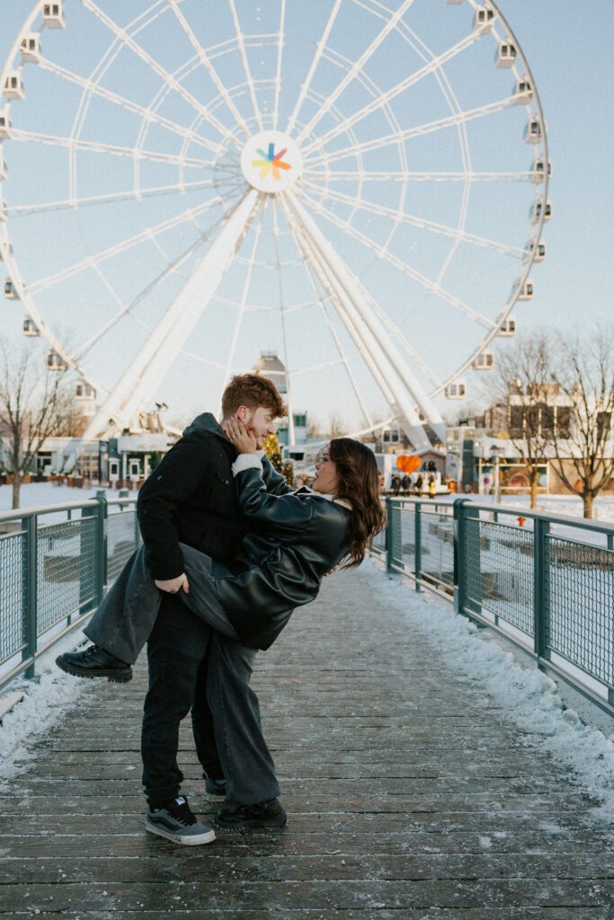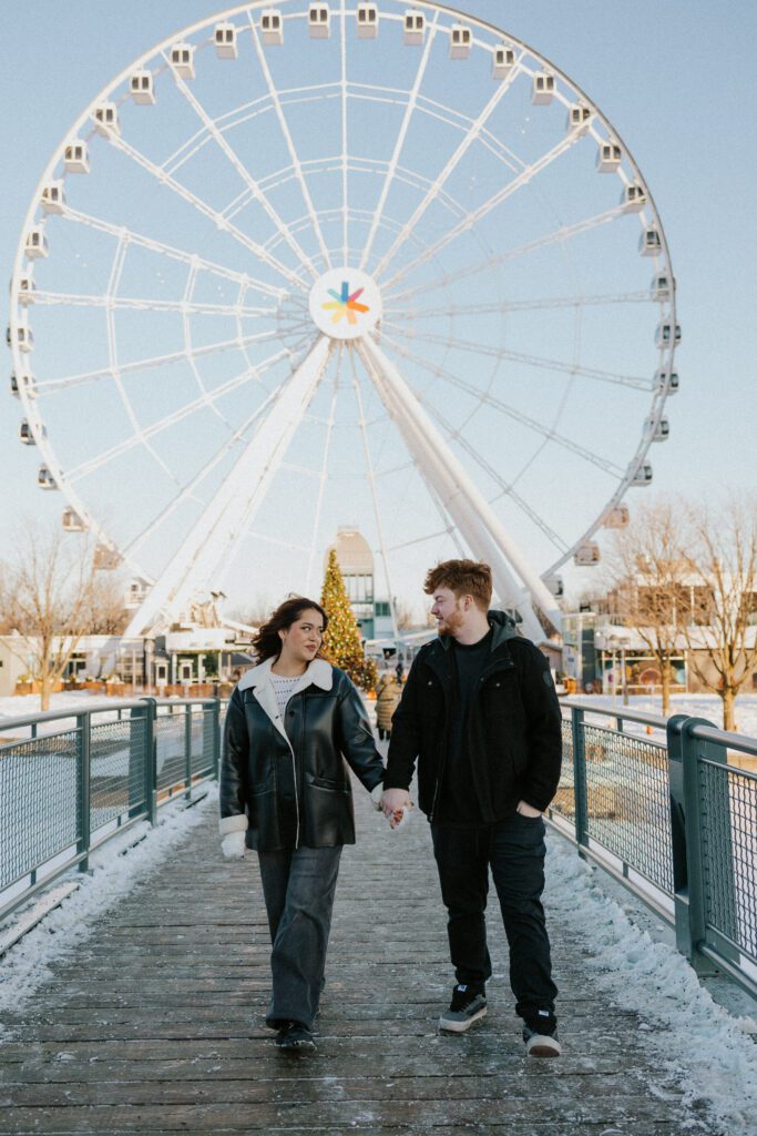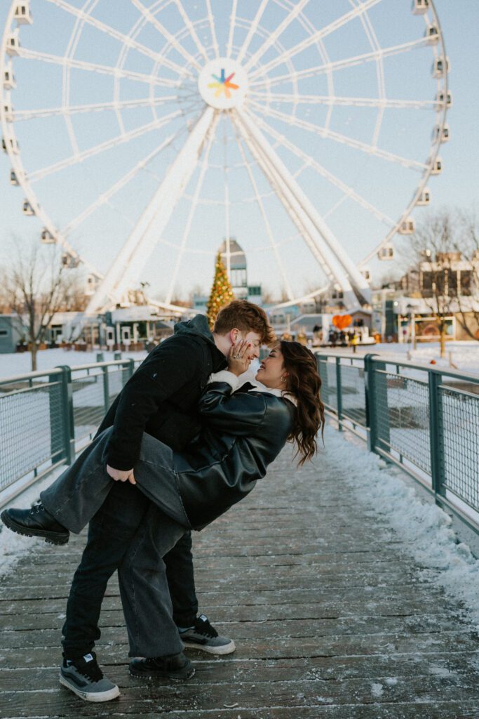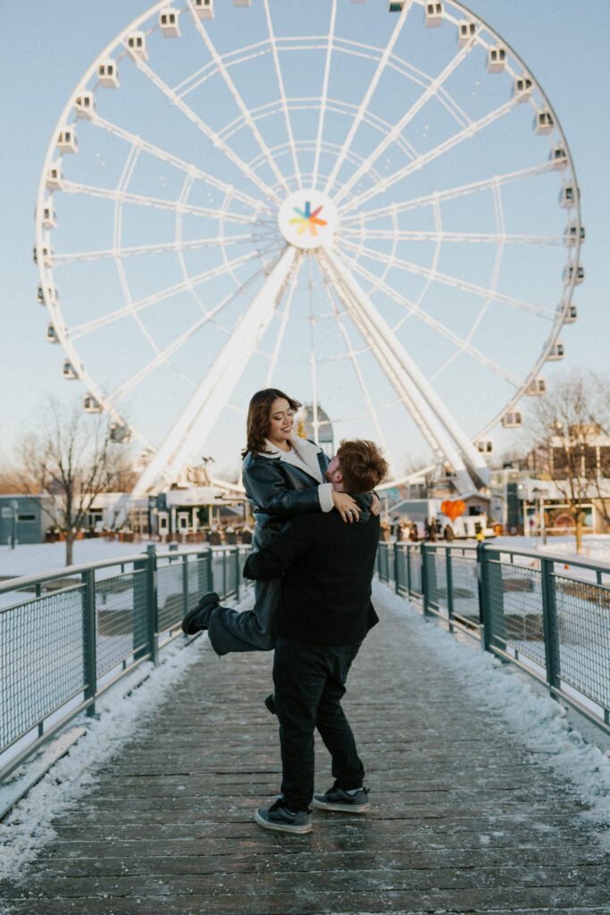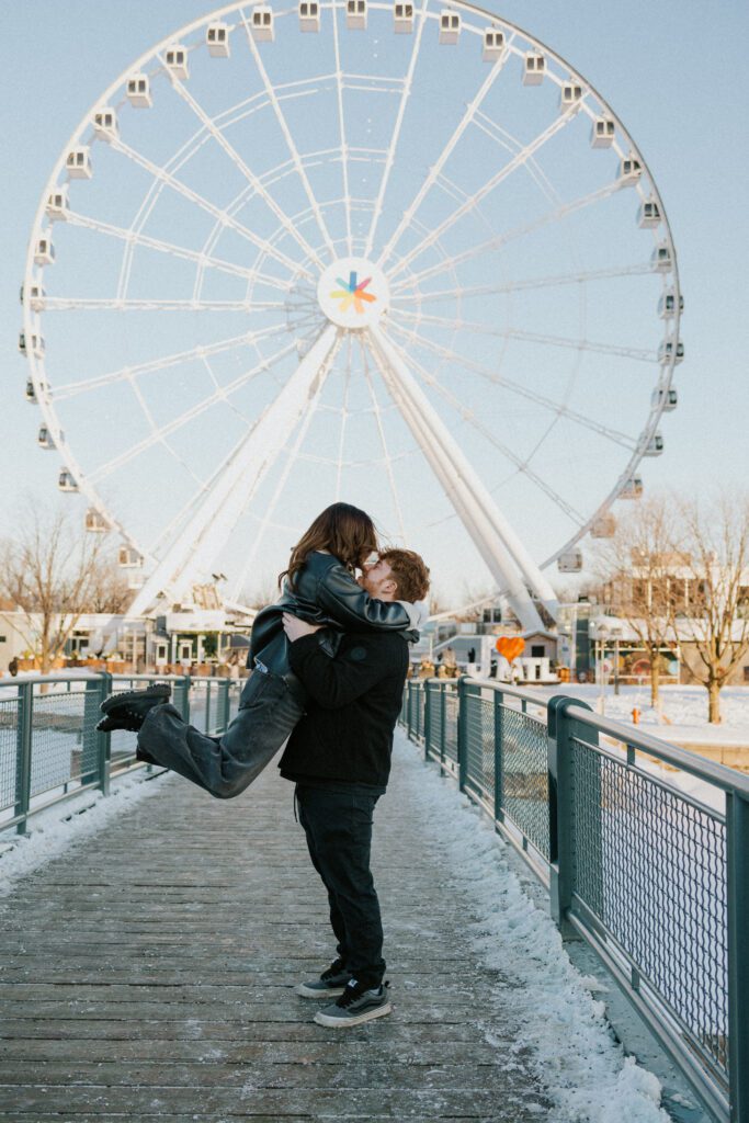 One of the most striking backdrops for engagement photos in Montreal is La Grande Roue de Montréal. In winter, the crisp air and snowy ground give the area a clean, bright aesthetic that feels fresh and elevated.