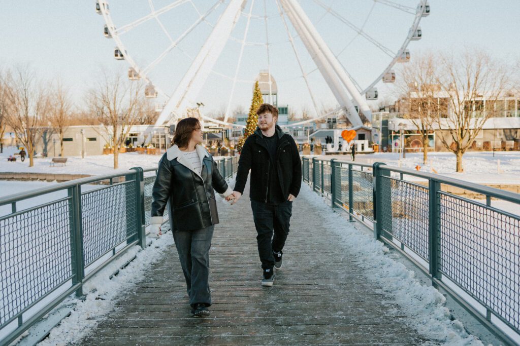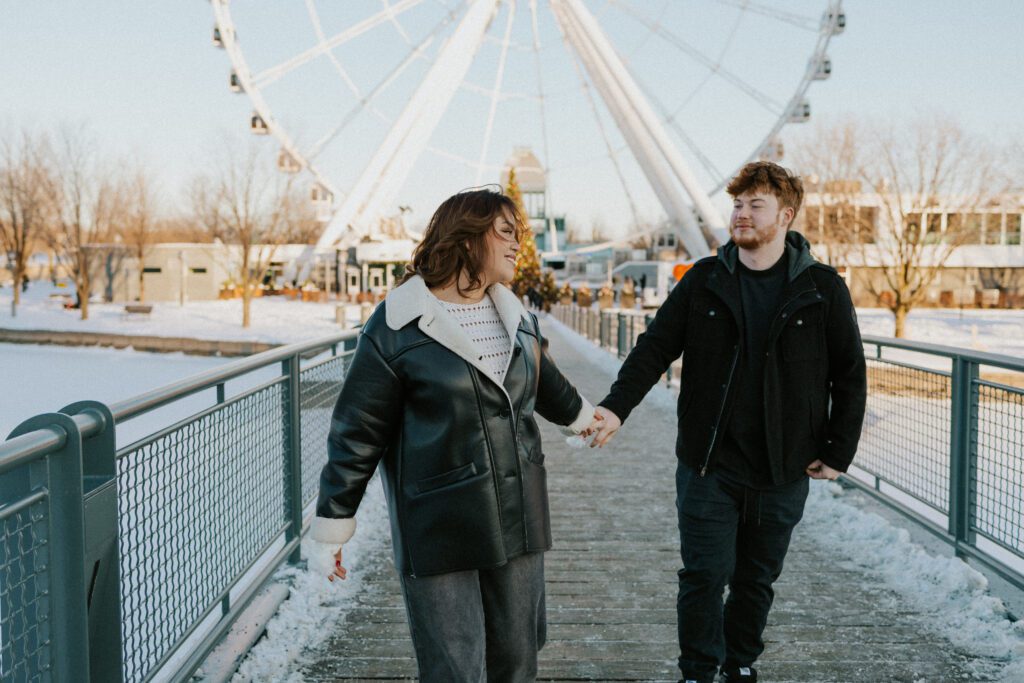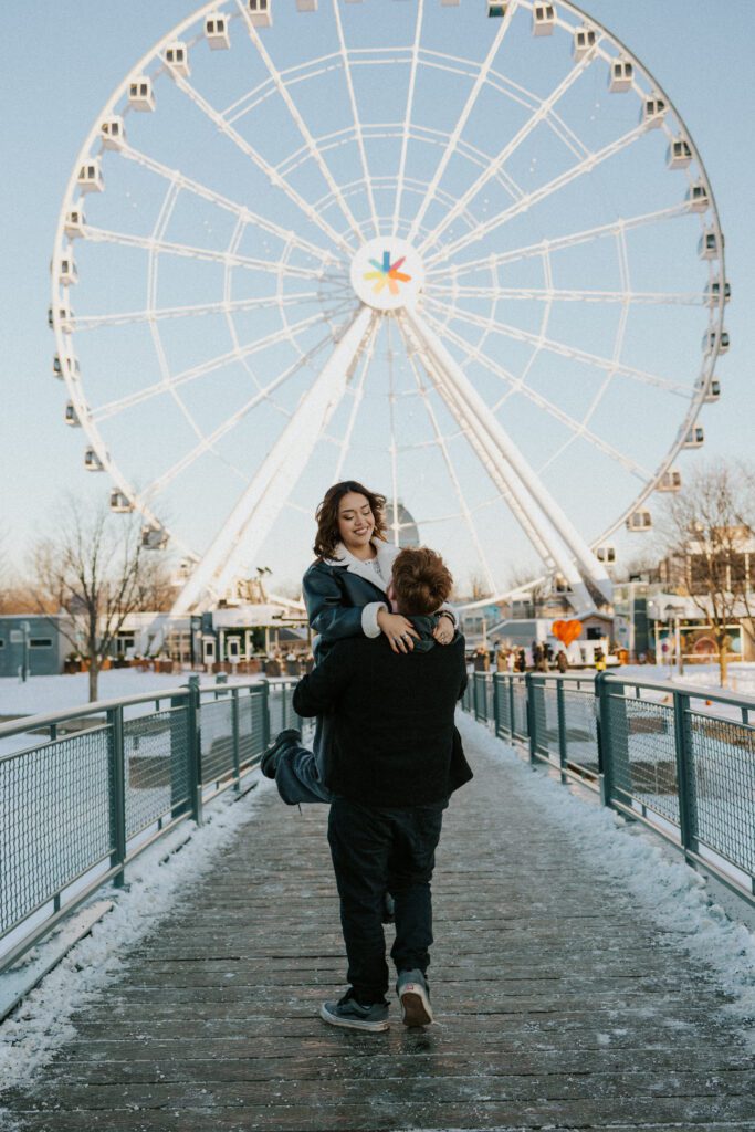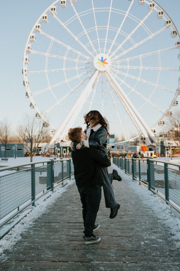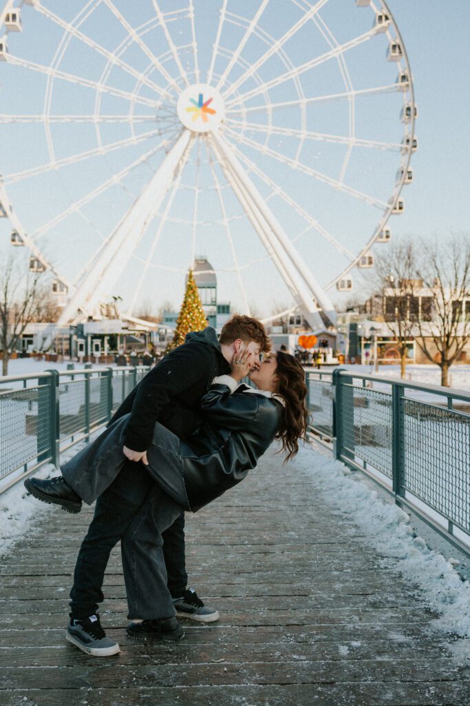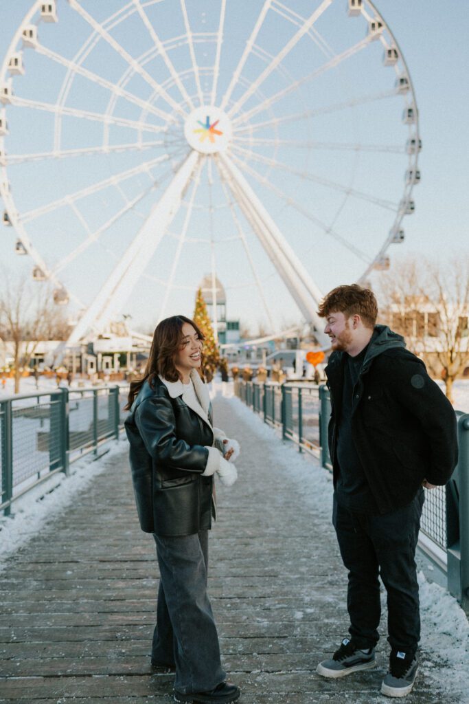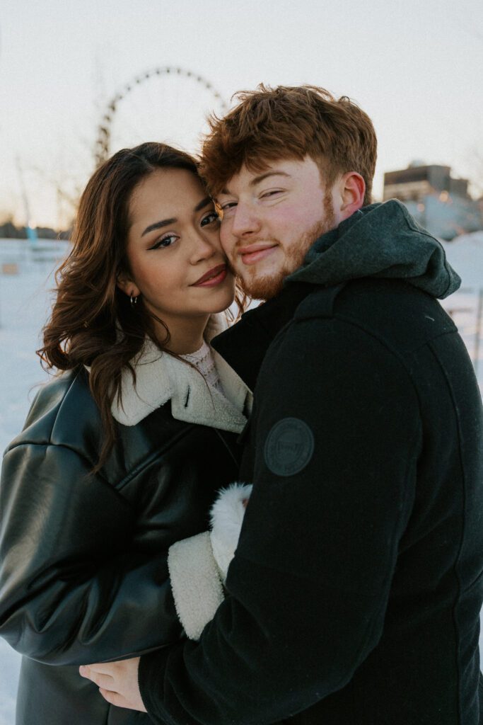 One of the most striking backdrops for engagement photos in Montreal is La Grande Roue de Montréal. In winter, the crisp air and snowy ground give the area a clean, bright aesthetic that feels fresh and elevated.