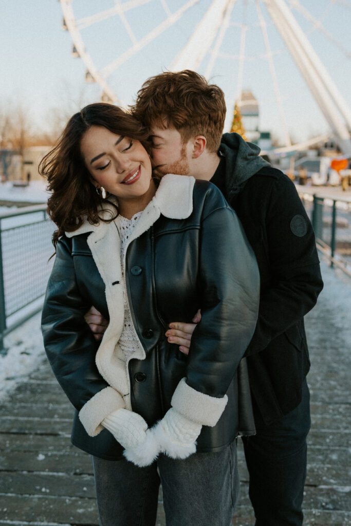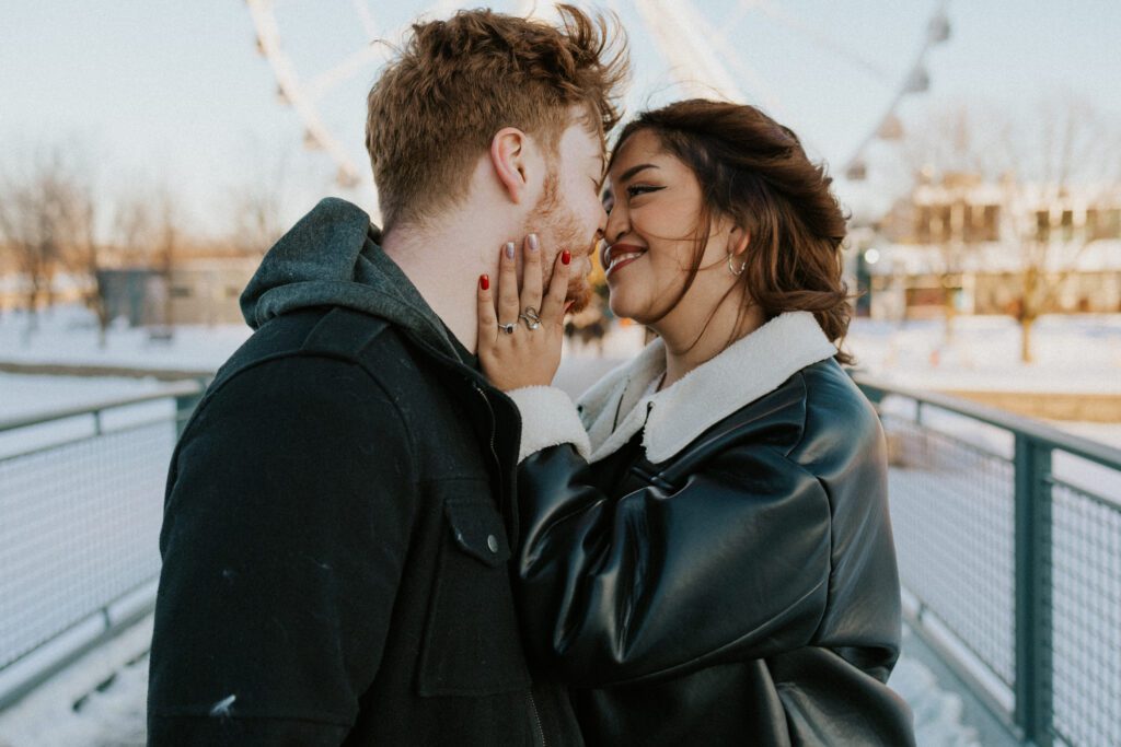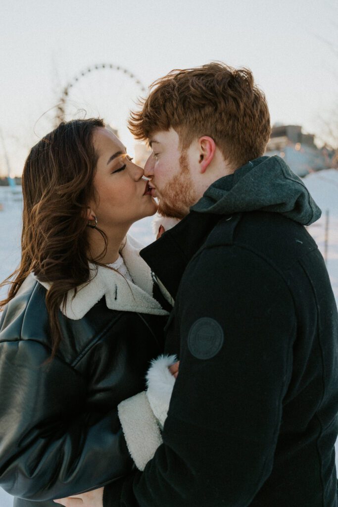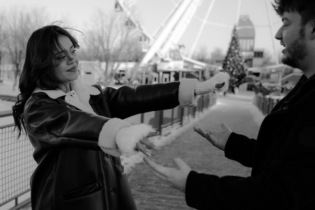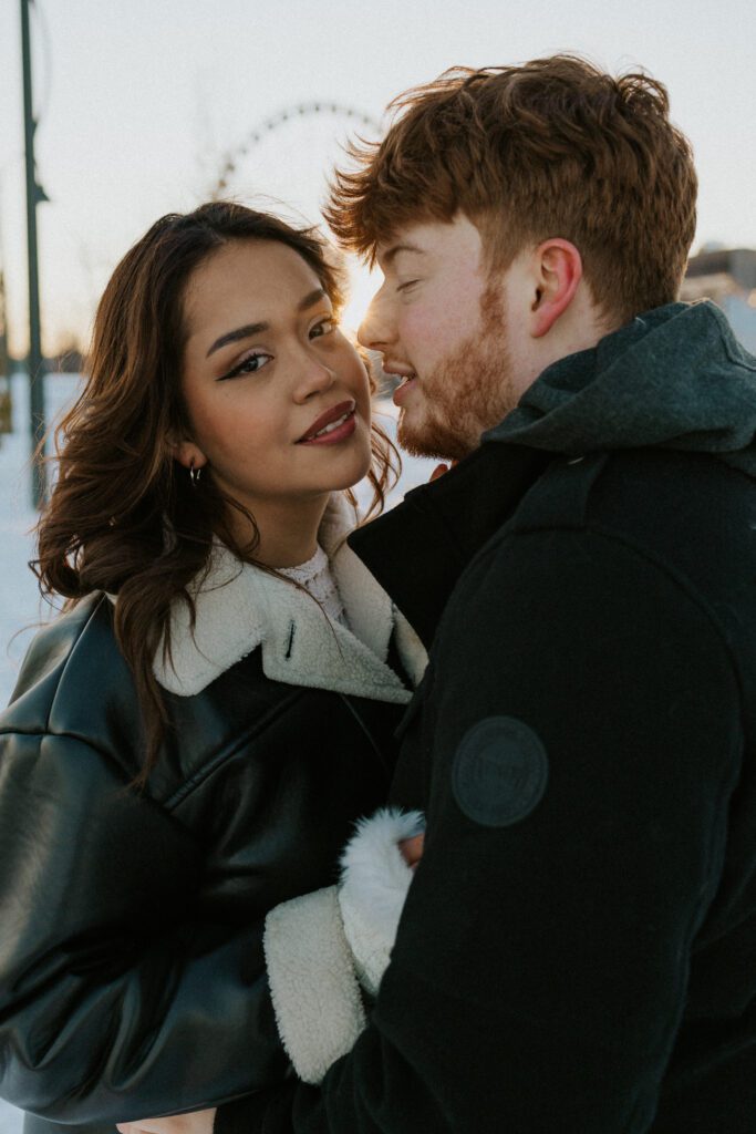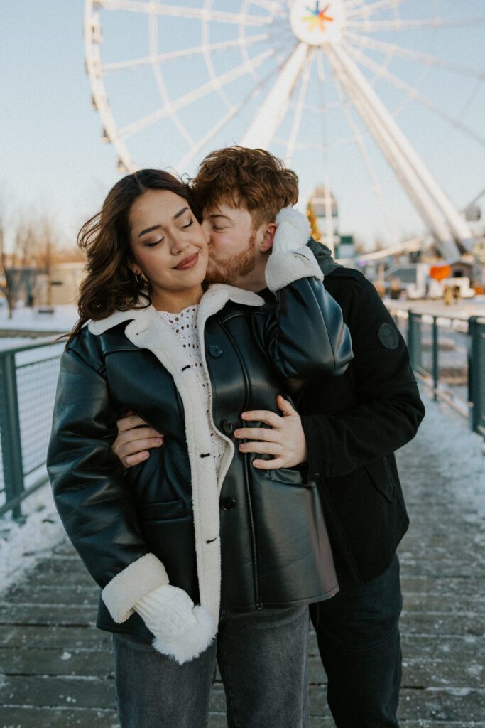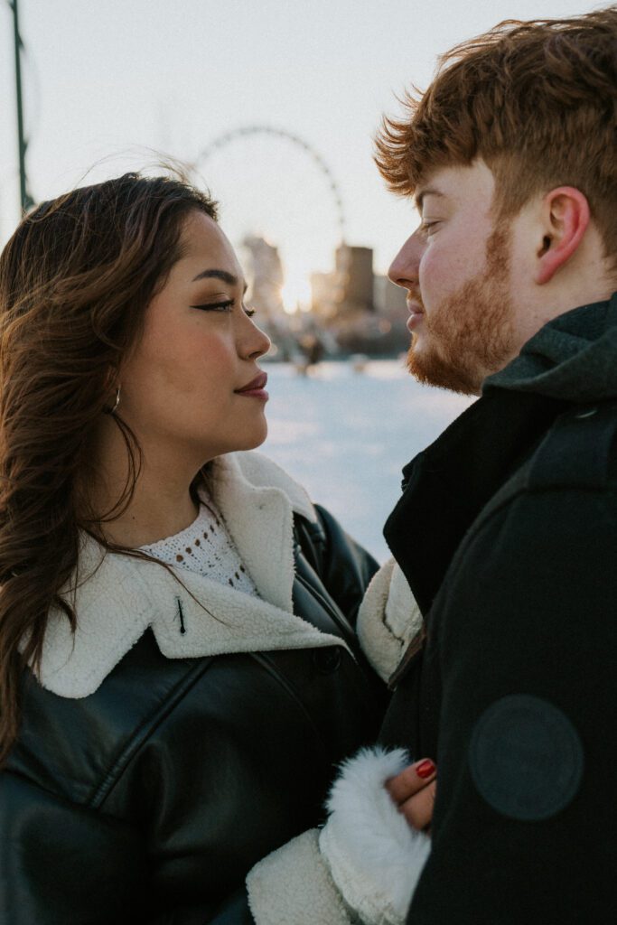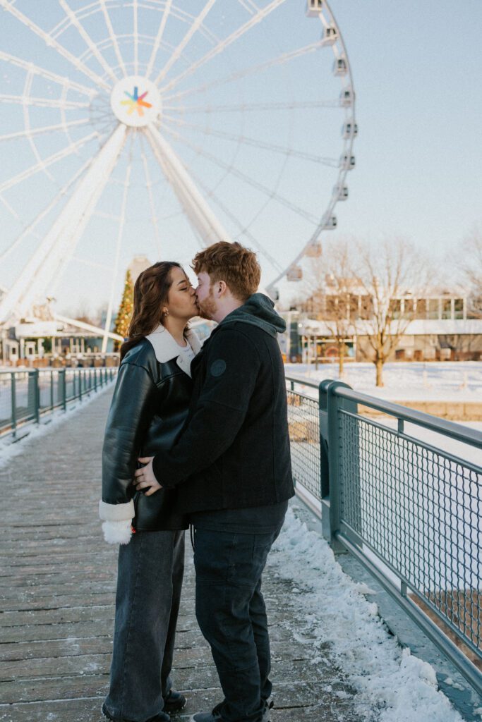 One of the most striking backdrops for engagement photos in Montreal is La Grande Roue de Montréal. In winter, the crisp air and snowy ground give the area a clean, bright aesthetic that feels fresh and elevated.