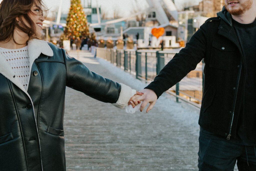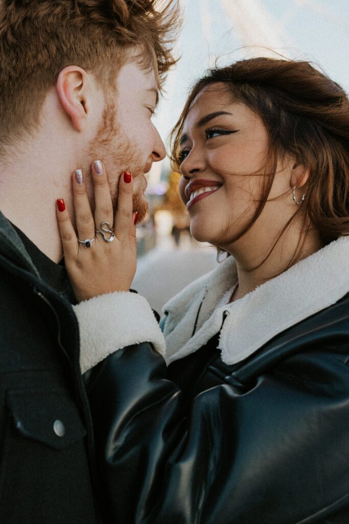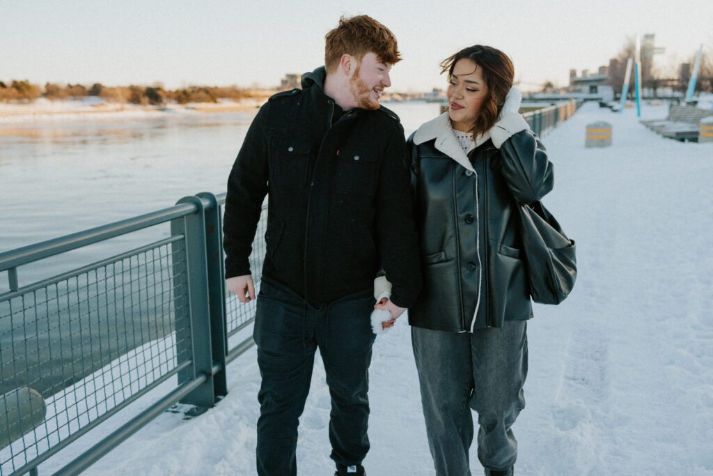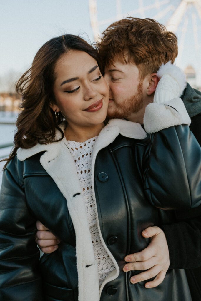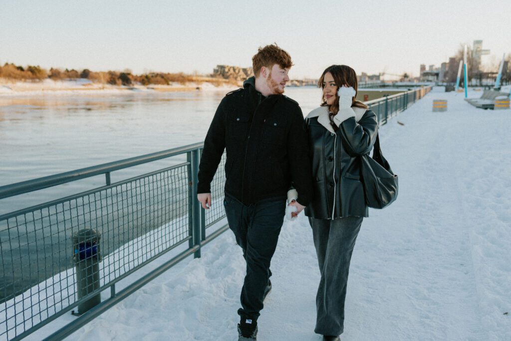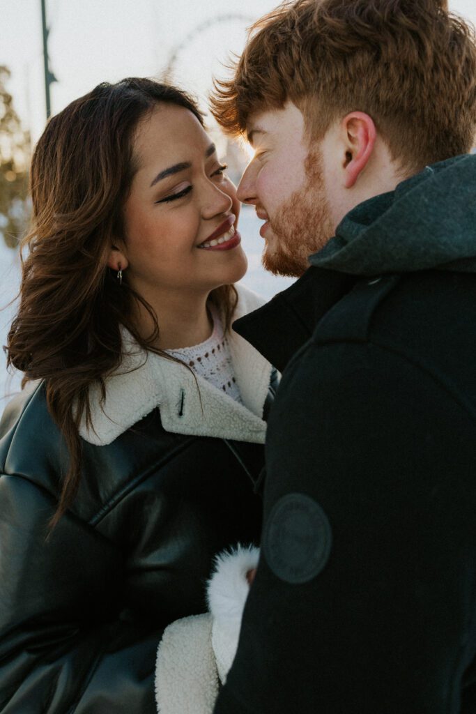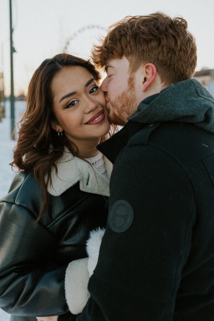 One of the most striking backdrops for engagement photos in Montreal is La Grande Roue de Montréal. In winter, the crisp air and snowy ground give the area a clean, bright aesthetic that feels fresh and elevated.