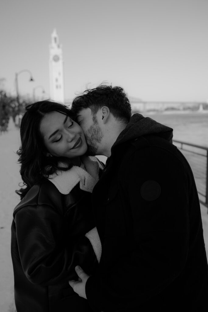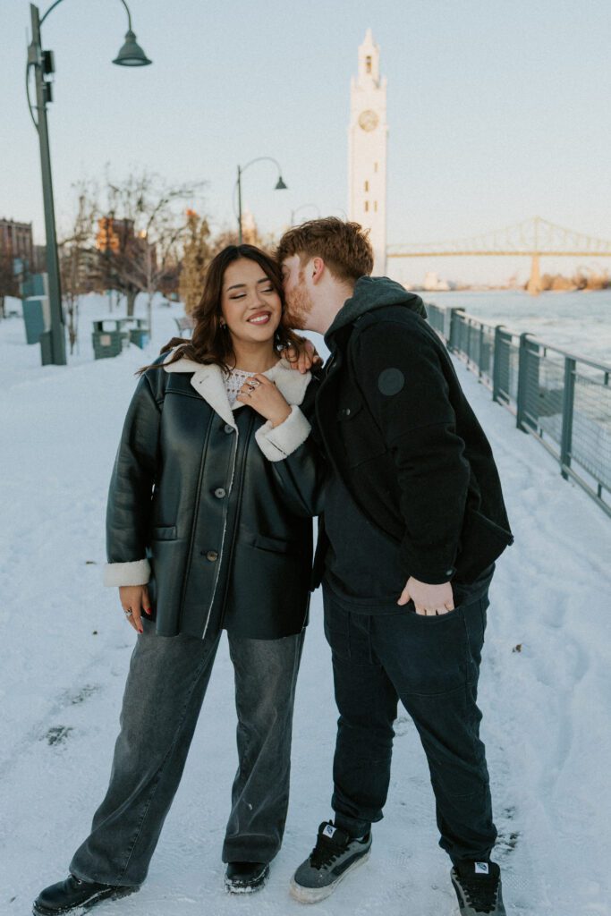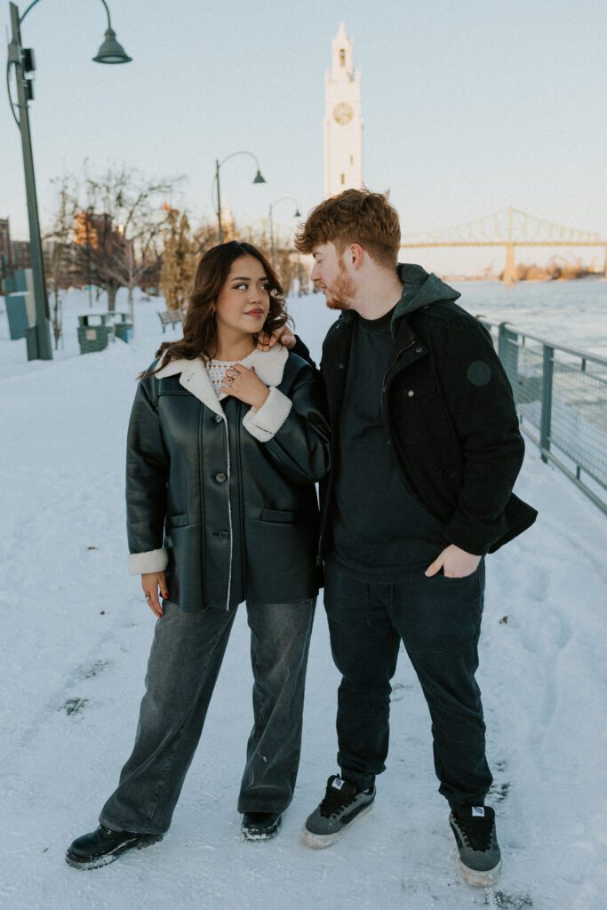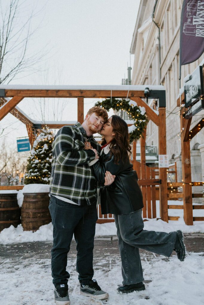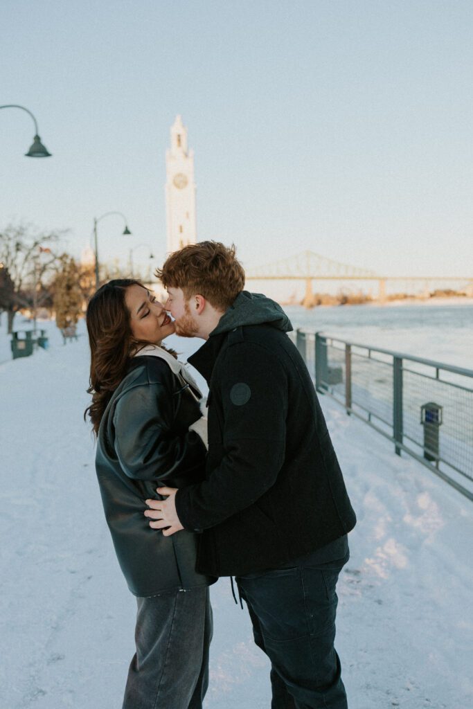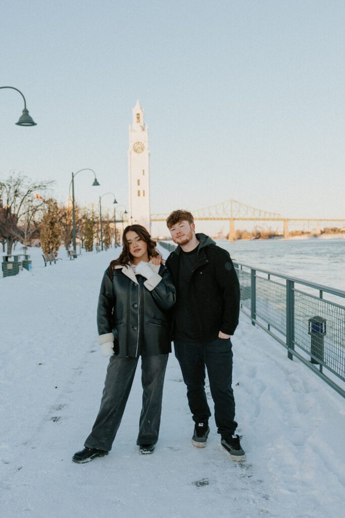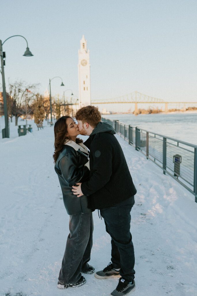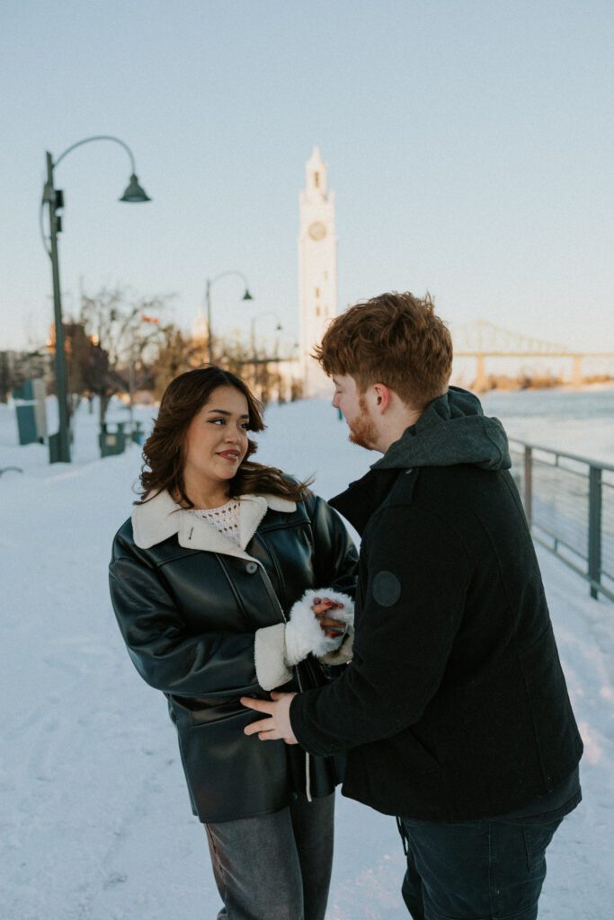 Winter engagement photos in Montreal feel intimate, elegant, and uniquely local. The snow reflects light beautifully, giving your skin a soft glow, while iconic Old Port landmarks add visual impact that instantly grounds your photos in place.