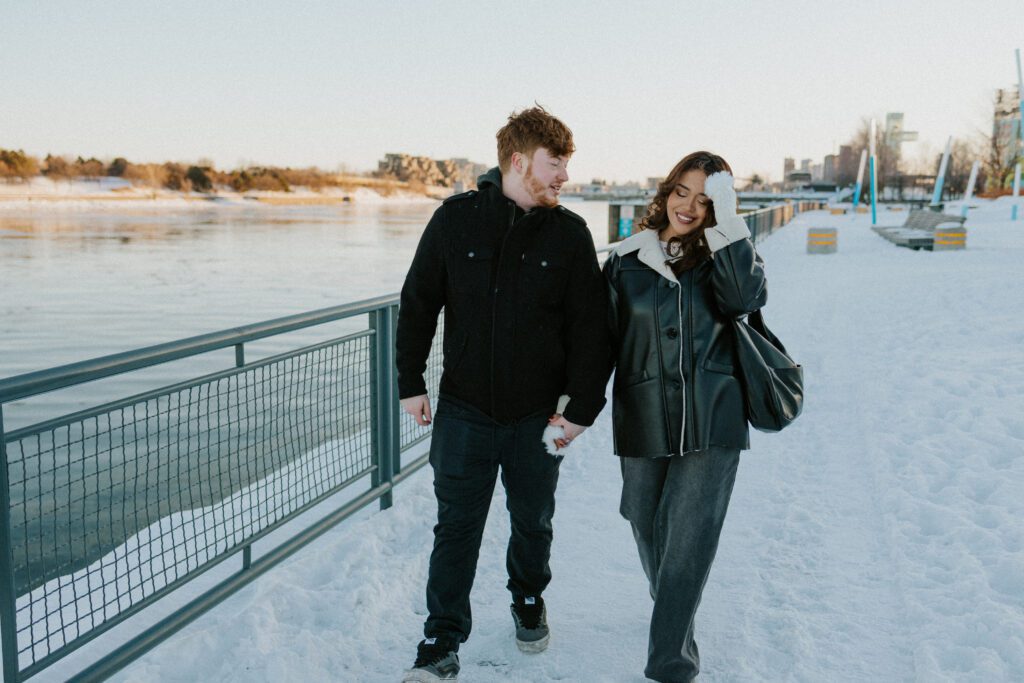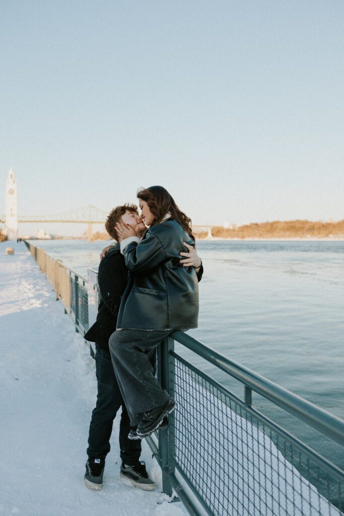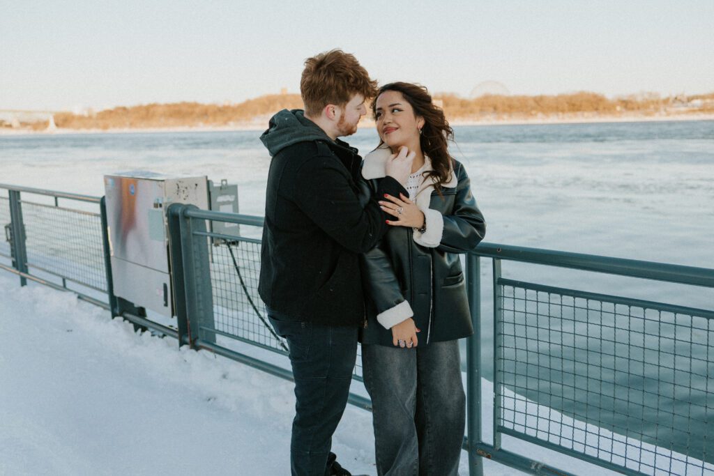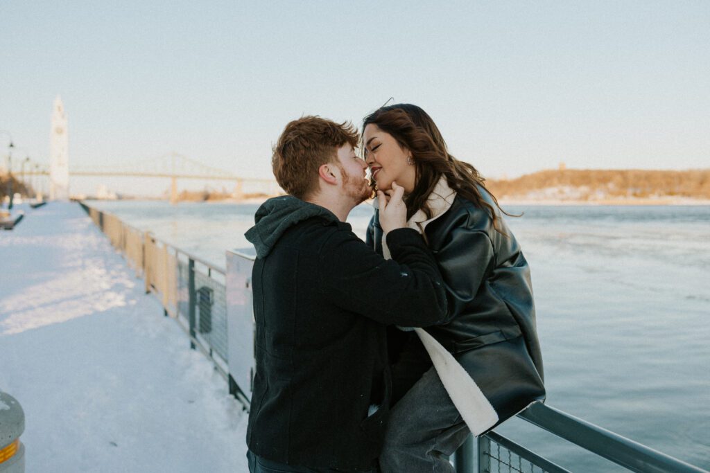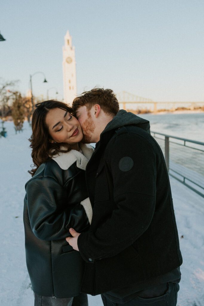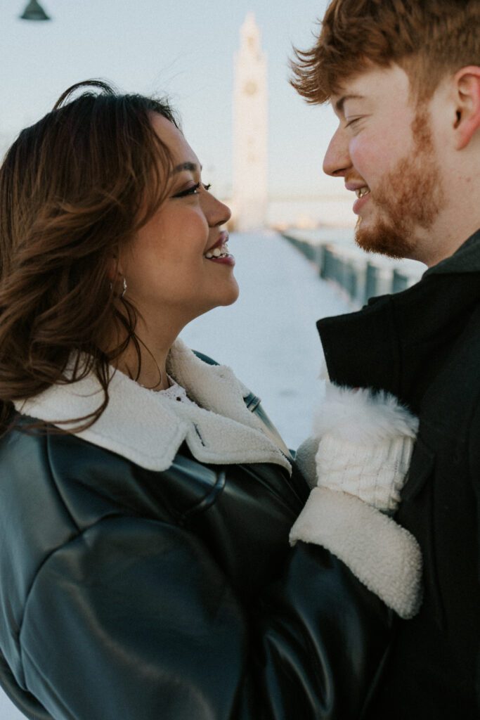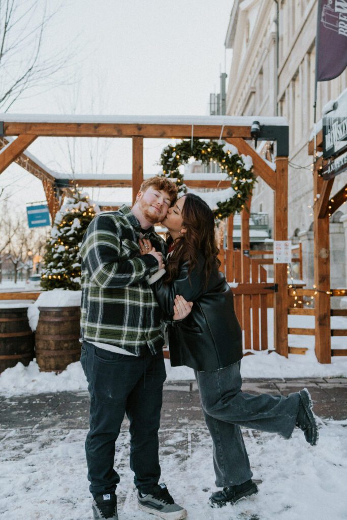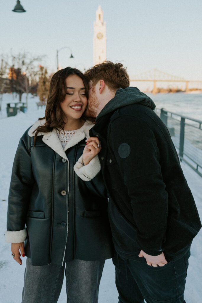 Winter engagement photos in Montreal feel intimate, elegant, and uniquely local. The snow reflects light beautifully, giving your skin a soft glow, while iconic Old Port landmarks add visual impact that instantly grounds your photos in place.