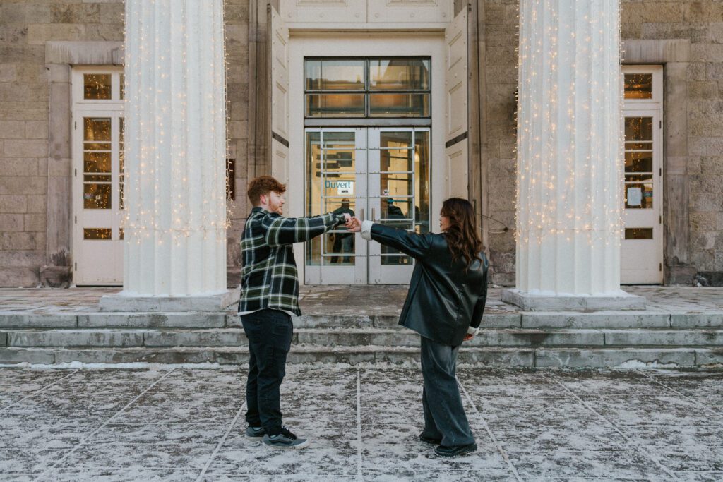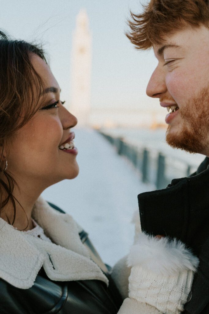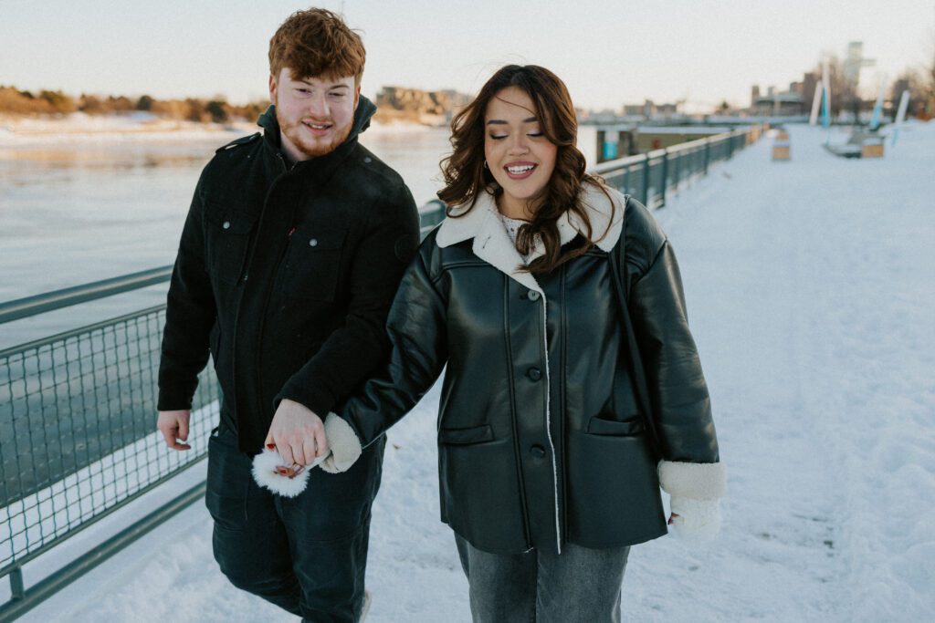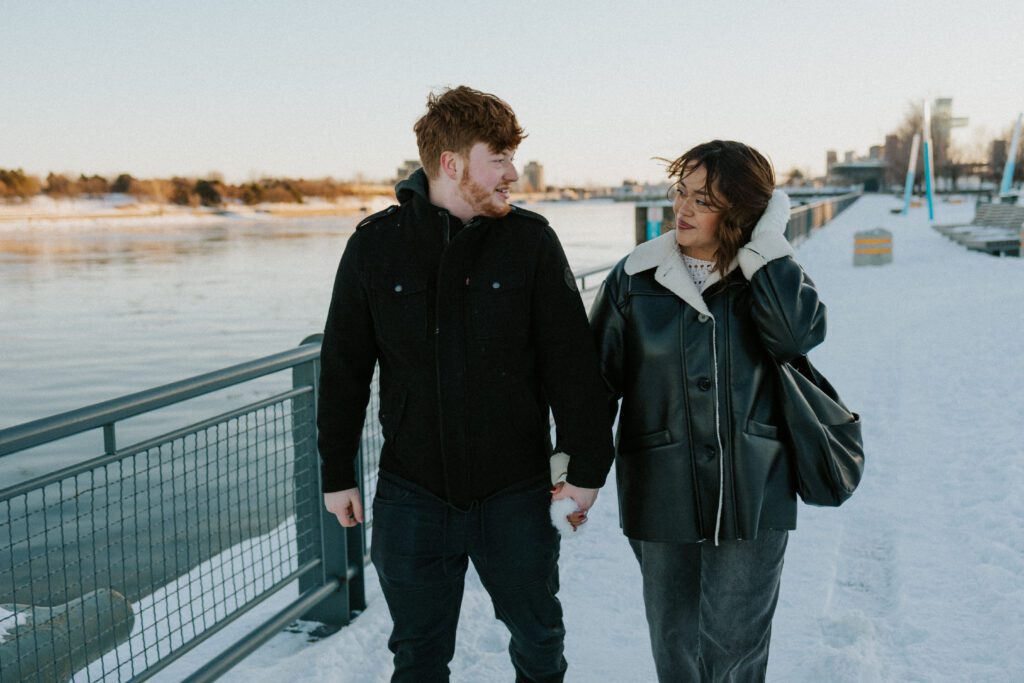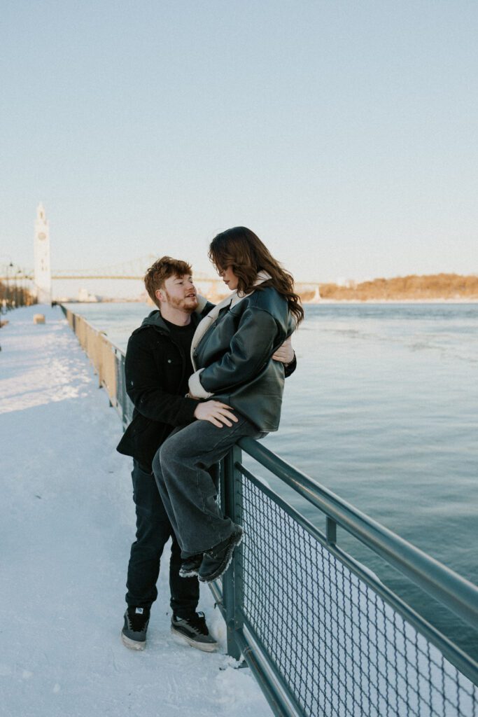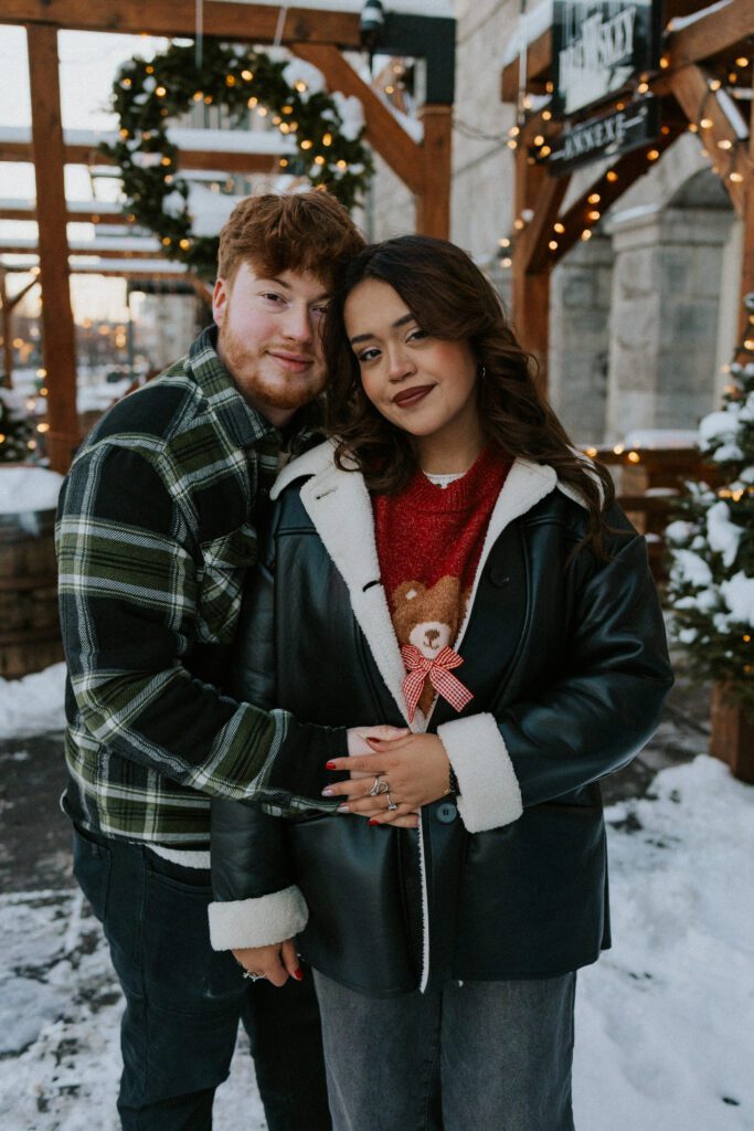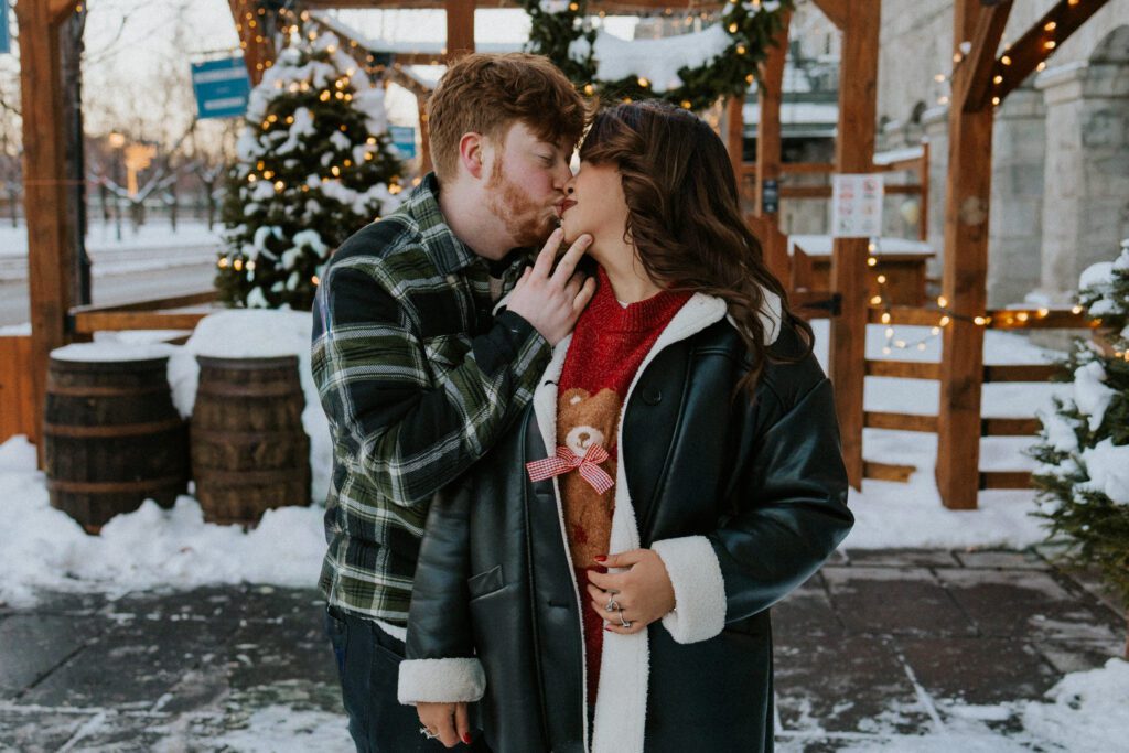 Winter engagement photos in Montreal feel intimate, elegant, and uniquely local. The snow reflects light beautifully, giving your skin a soft glow, while iconic Old Port landmarks add visual impact that instantly grounds your photos in place.