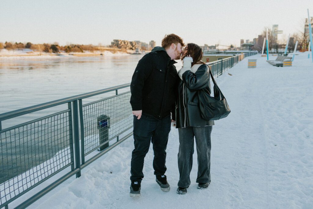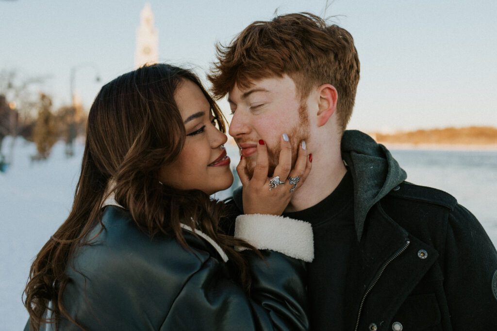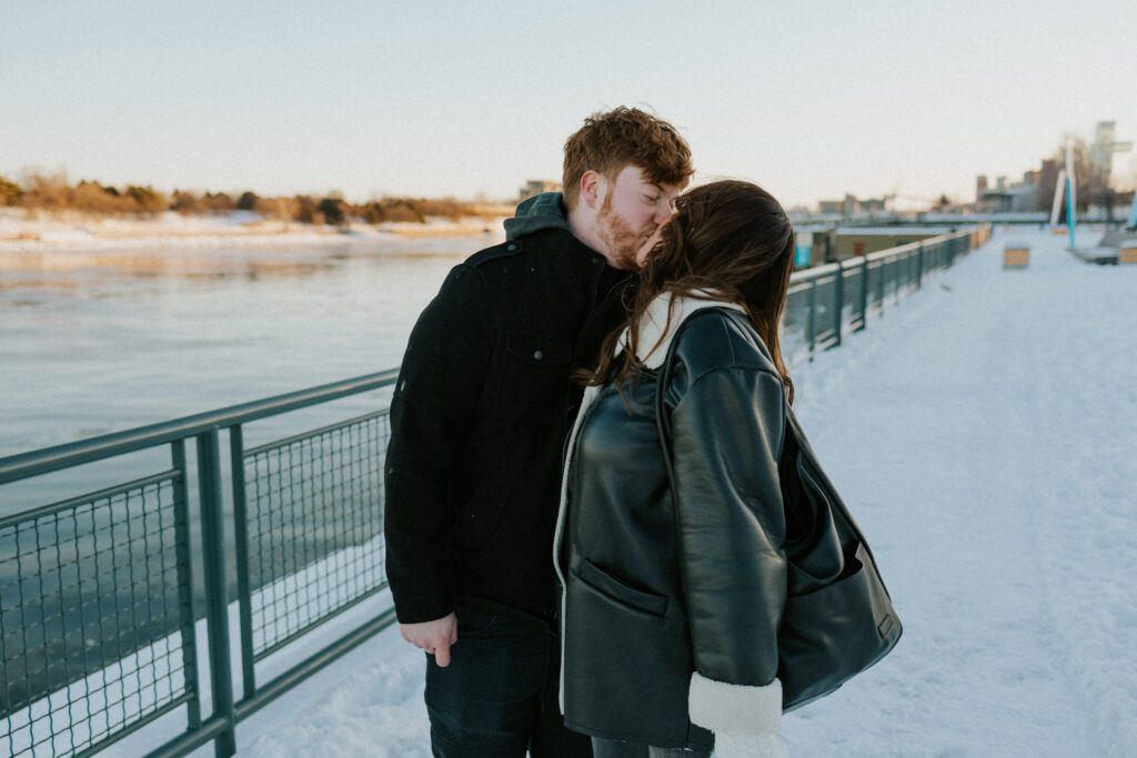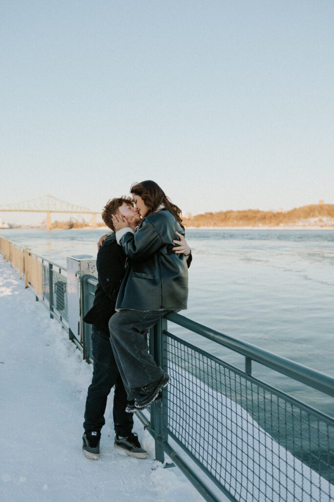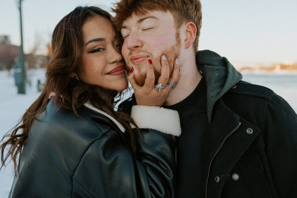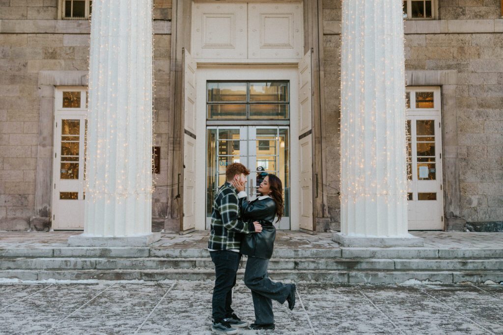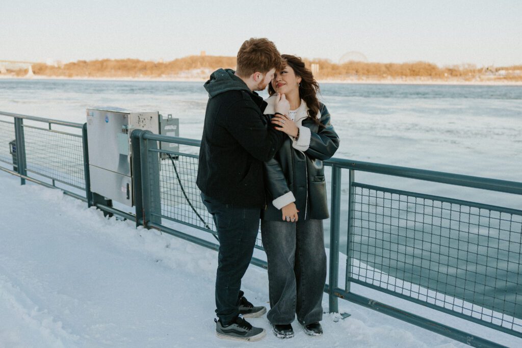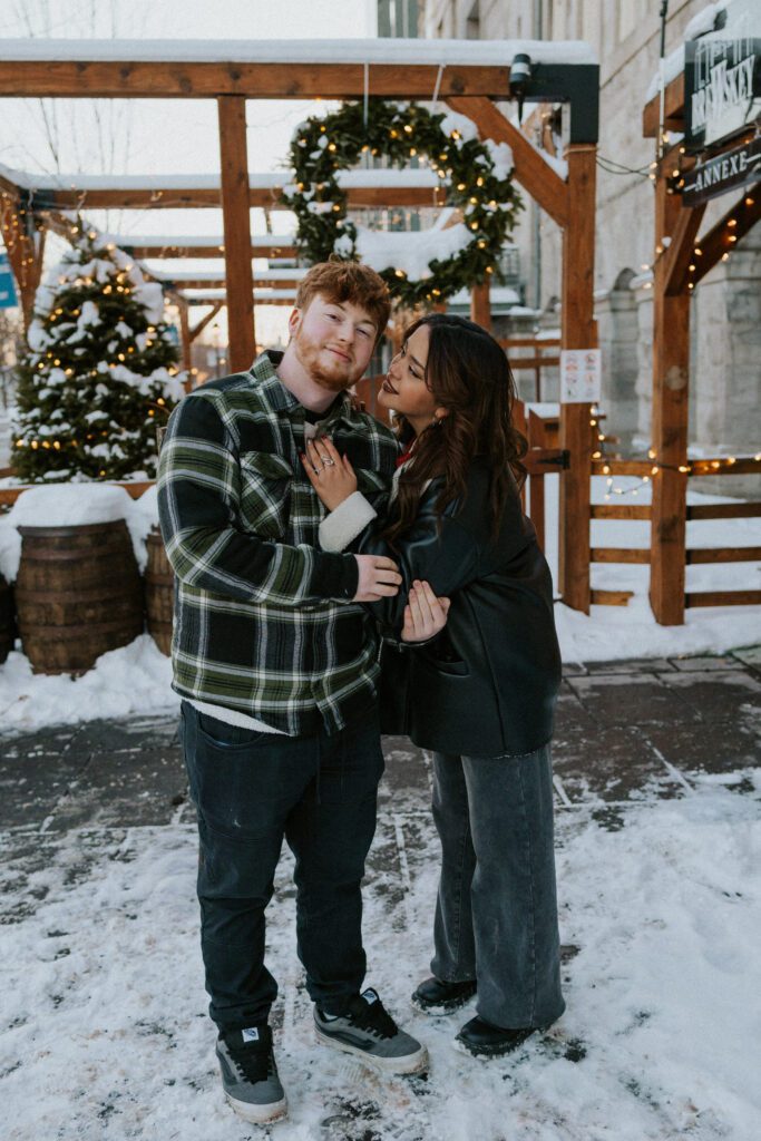 Winter engagement photos in Montreal feel intimate, elegant, and uniquely local. The snow reflects light beautifully, giving your skin a soft glow, while iconic Old Port landmarks add visual impact that instantly grounds your photos in place.