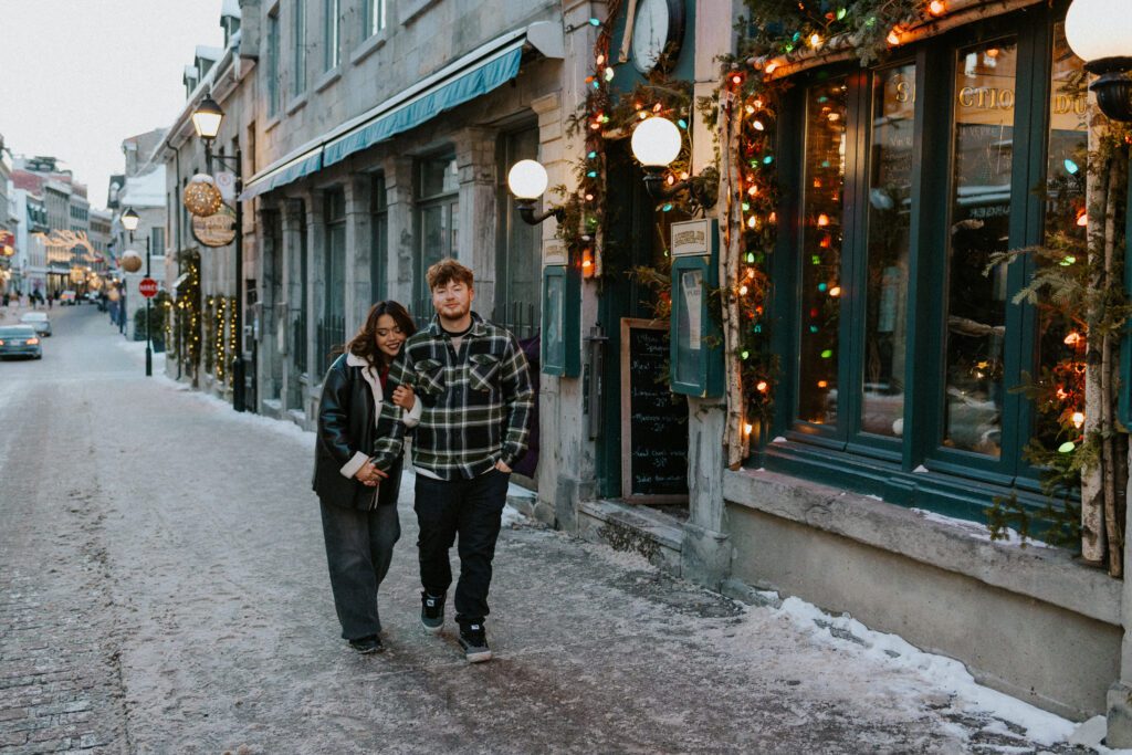 Beyond the landmarks, some of the most meaningful engagement photos happen in the quieter streets nearby. Old Montreal’s cobblestone roads, industrial details, and soft winter light create the perfect atmosphere for candid, cozy moments.