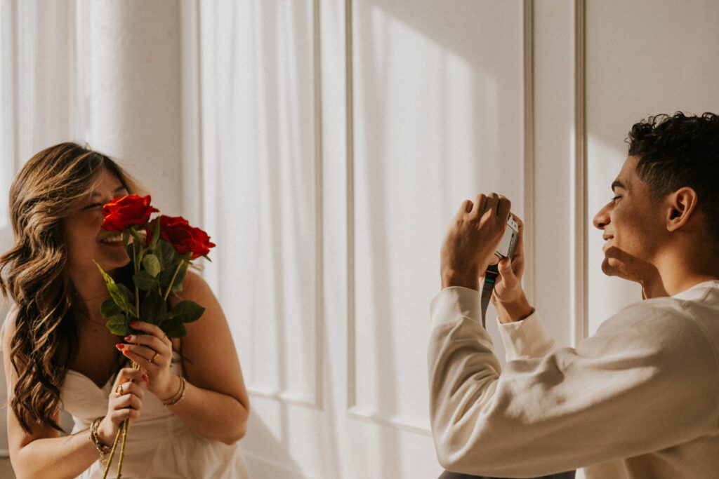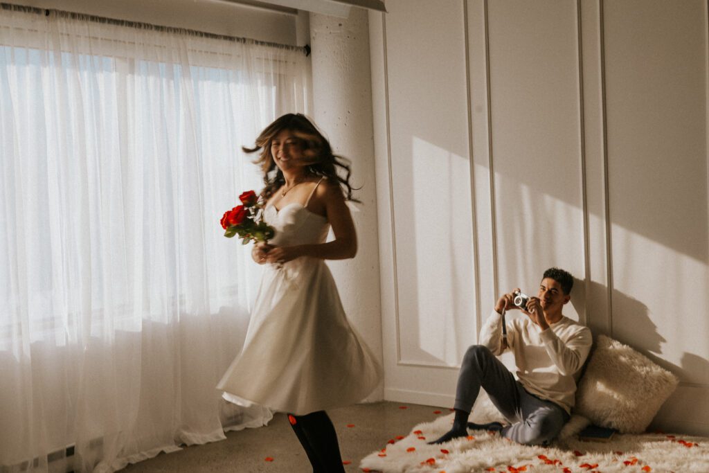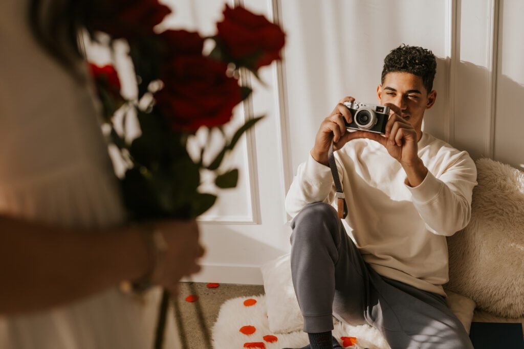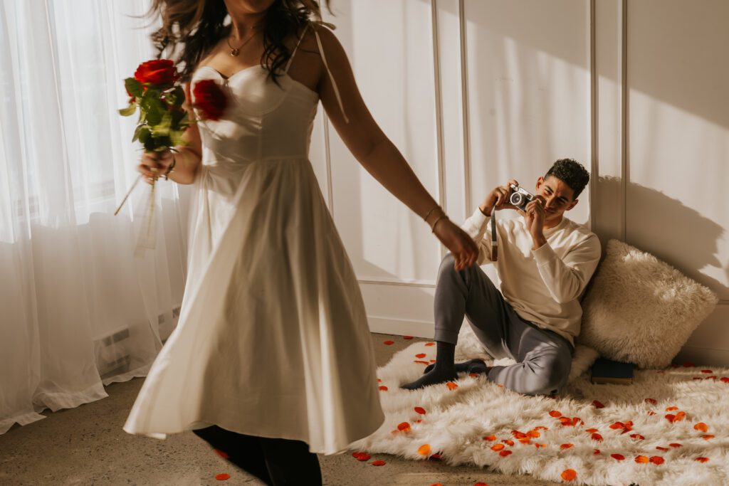 The film camera added playfulness. At one point, one partner pretended to photograph the other. They laughed. They teased. They moved naturally. Some of the most authentic images happened during those unscripted moments.
